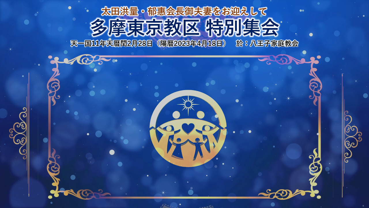 太田洪量・郁惠会長御夫妻をお迎えして特別集会(陽暦2023年4月18日) 2023/04/18 最終更新日時 : 2023/04/20 八王子家庭教会 【 礼拝のみ言 】 天一国十一年天暦閏2月28日(陽暦2023年4月18日) 説教者:太田 洪量 会長 過去の礼拝のみ言 <教会行事案内> ○天一国日曜礼拝 日時:4月23日(日)開会:10:00 場所:八王子家庭教会、インターネット中継